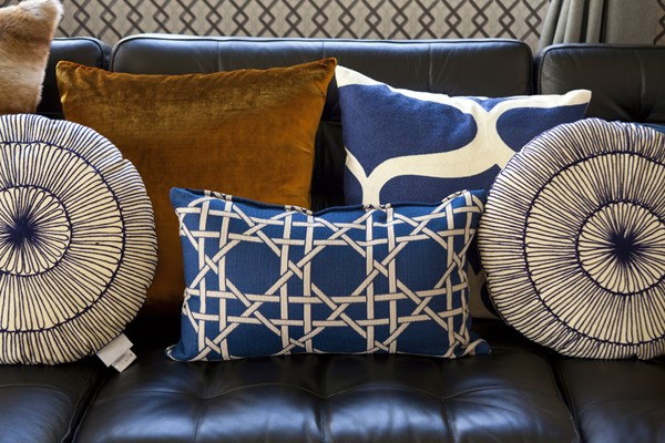 Change up the fabrics and textures too. Put a crisp black canvas or duck weave with a soft green and blue velour print. Or mix a paisley pattern with stripes or blocks. The variety draws the eye to multiple places and can even camouflage a dated sofa or chair.